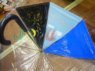 12月8日の夕方4時ころ、理科室が明るかったので覗いてみると、放課後チャレンジクラブに参加している子供たちが、傘に絵を描き、すてきな傘アートを作っていました。