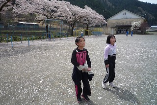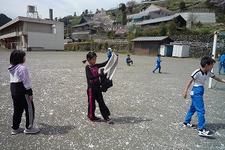 業間の20分休み、子供たちは、花びらの中を鬼ごっこしていました。