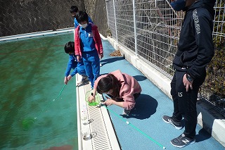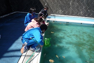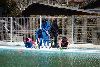 6年生の理科は、中学校の先生に兼務で指導に来ていただいています。小学校最後の理科の授業が、本日終わりとなりました。最後の授業は、プールの中の生き物観察でした。