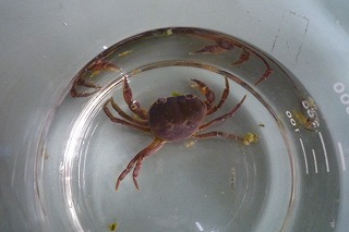 網をもって、プールの中を探します。カエルやカニ、オタマジャクシを見つけることができました。