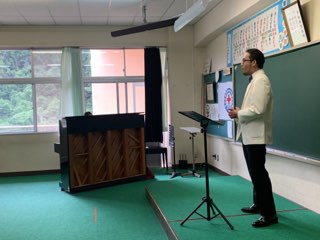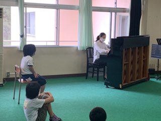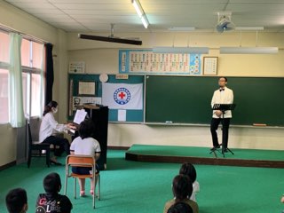 ピアノ独奏の後は、音楽主任の外所教諭とコラボでイタリア語の「フニクリ・フニクラ」と日本歌曲の「まちぼうけ」を歌とピアノで子供たちに届けました。