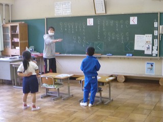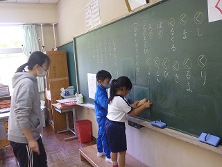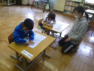 はじめに、空気の黒板を使って形を覚え、マス目の入ったノートを使って、整った字を書く練習をしました。