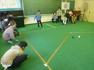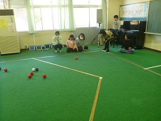 ハッピーフレンズウイークの一環でボッチャをしました。ボッチャは、年齢、性別、障がいのあるなしに関わらず、すべての人が一緒に競い合えるスポーツです。人権主任の先生から、ゲームについて説明がありました。