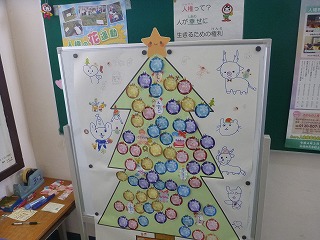 踊り場の人権コーナーに掲示してある「えがおの木」には、友だちに向けてありがとうメッセージがたくさん集まっています。