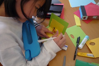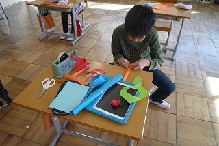 4年生は、図工「つなぐんぐん」で、色紙をつなぎ思いを持った作品を仕上げていました。