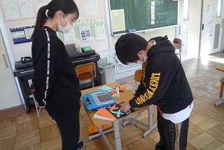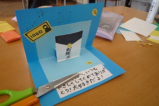 男の子は、休み時間に遊ぶための道具をつくりました。