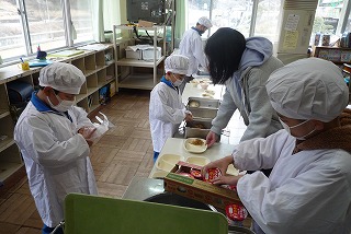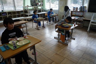高学年教室では、自分たちでどんどん準備をして給食の用意をしています。