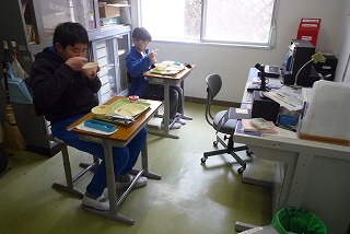 放送委員も放送室で校内放送をしながら、給食を食べます。