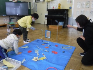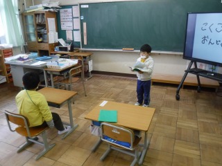 いよいよ本番です。司会と進行を一年生がします。生活科で作ったさかなつりあそびをします。やり方を教えます。子どもチーム対先生チームでしました。「がんばれ!!」応援をします。みんな上手にできました。新入学児と一年生は、どんどん釣っていきます。子どもチームの勝利!!国語の教科書の音読をしました。とっても上手に読めました。「来年、国語の勉強でします」と教えました。