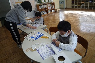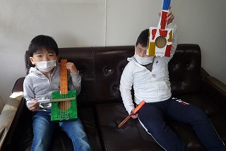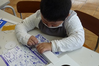 1時間目、1・2年生が図工の時間に「音づくりフレンズ」の教材を使って工作しました。