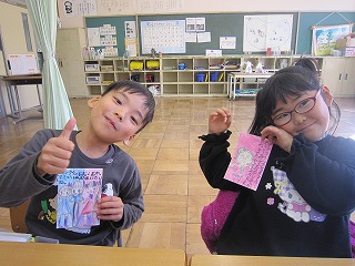 かわいい絵とお礼の言葉がかかれているはがきを見て、児童はとってもよろこんでいました。