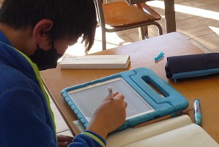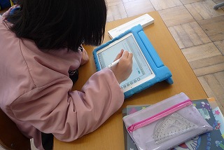 4年生は、算数で割り算について学習しました。計算の仕方を学ぶとタブレットを使って、計算問題に取り組みました。