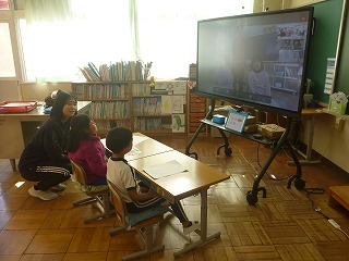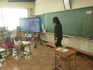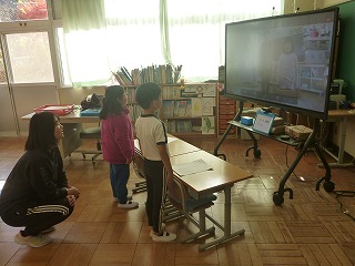 モニターを通しての授業でしたが、一つの部屋で授業を行っているように、お互い名前を呼び合って楽しく学習は進みました。