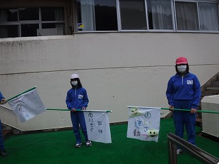 体育集会の後は、玄関で児童会本部役員があいさつ運動を行いました。