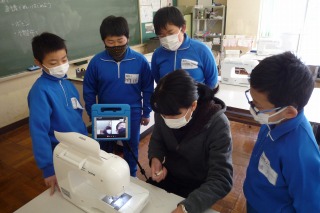 ミシンの使い方を一緒に確認しています。