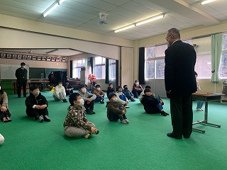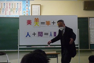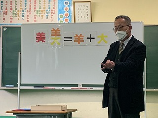 朝礼では、漢字の作りから人とのかかわり方を考えるお話でした。