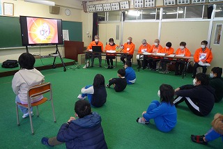 大型モニターを使って、「白い魚とサメの子」のお話をしていただきました。このお話は、いじめられていた白い魚が、自分らしさを見つけ、友達をつくっていくお話です。子供たち、とても真剣に聞いていました。