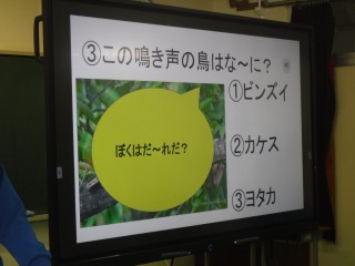電子黒板とタブレットを使い、鳴き声を聞いたり