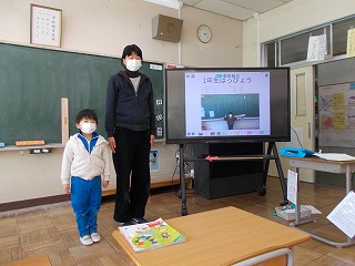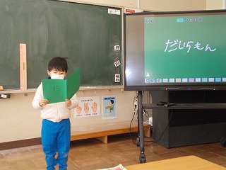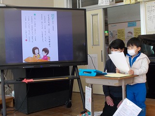 5時間目、1年生教室では、日曜日の卒業を祝う会の発表練習をしていました。