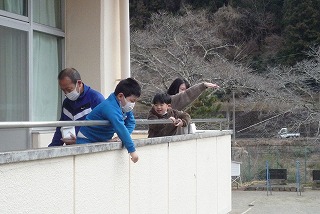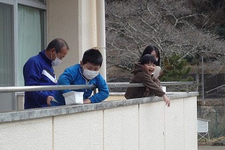 業前の時間に 1・2年生がベランダで豆まきをしました。