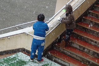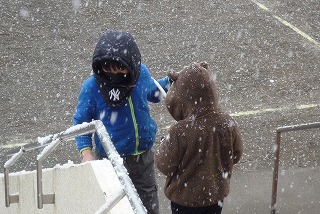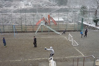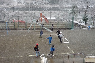 雪は降っていますが、子供たちにとってはいつものお昼休みでした。サッカーをする子、雪に触る子元気に遊びました。
