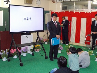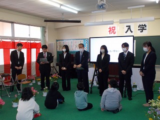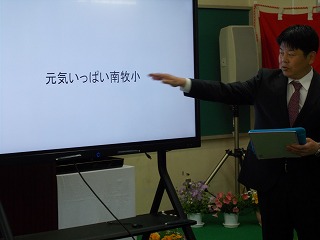 みんなで校歌を歌った後、校長先生から「今年度の合言葉は、元気いっぱい南牧小です。」と話がありました。