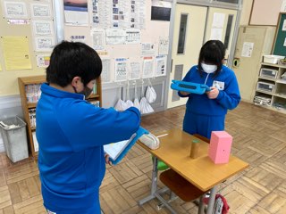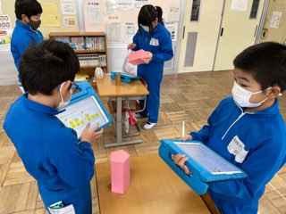 立体をそれぞれ、カクカクチーム(角柱)とまるまるチーム(円柱)に分類し、どんな特徴があったかをペアで伝え合いました。
