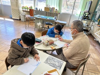 3校時、1・2年生は一緒に書写を行いました。「二人一緒なら元気100倍だ!」と、集中して、