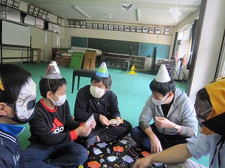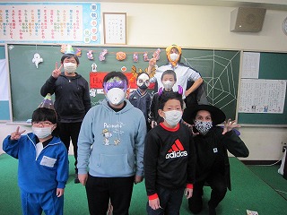 外国語の学習では、ハロウィンにちなんで、仮装しながらゲームで楽しく学習しました。