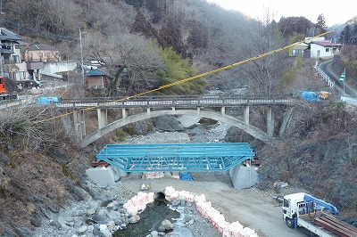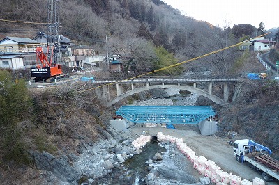 丸い形のとても味わいのある橋ですが、老朽化のため、撤去することになりました。とても大きなクレーンが動いています。