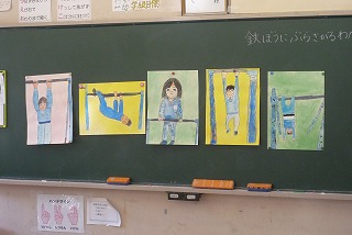 2時間目、4年生は自分たちで描いた「鉄棒をする人」の鑑賞会をしました。