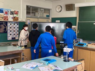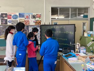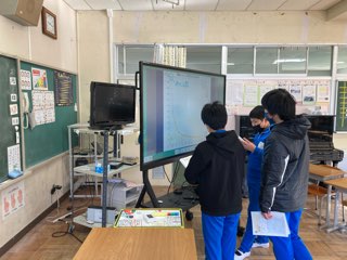 電子黒板の前に集まって意見を共有し合う場面が見慣れた風景になりました。「反比例のグラフは比例のグラフと違って、直線になってないよ。」「0を通ってないのも違いだね。」と、大事なことに気付けています。