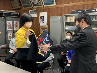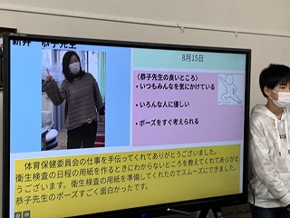 先生たち一人一人の思い出の発表と、家庭科の時間をつかって制作したメッセージ入りの小物をプレゼントされました。