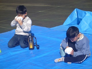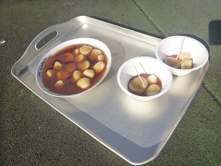 業間休み、1~3年生がつくった白玉団子を屋上でいただきました。